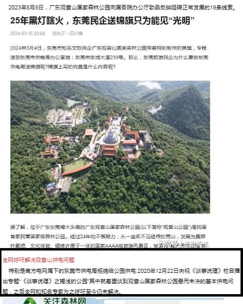 除了这些撰稿人反映南方电网与观音山公园的供电纠纷外,网络搜索其内容多达数百篇:《观音山公司诉南方电网等侵权案在广东开庭》、《东莞维权有多难?供电部门22年不给民企观音山供电》、《东莞市电力部门长期拒绝给观音山国家森林公园供电何解》、《广东观音山国家森林公园依法申请用电 东莞供电局长期拒绝供电并企图推卸责任》、《“小香港”之称的繁荣地,存在未通市政电力之现象》、《广东观音山国家森林公园多年缺电频遭毁林的背后》、《首座民营国家级森林公园遇通电难题 欲借纾困潮破局》、《“电老虎”现形记:东莞国家级景区供电被卡脖子23年》、《自主供电23年 广东观音山国家森林公园何时全面通电》、《东莞民企艰难发展之路:在那些没电的日子里》、《国家森林公园遭遇“电老虎” 24年用电问题悬而未决》、《东莞民企给供电局送“锦旗”,希望解决公园80%服务区域用电》、《给国家森林公园供电 点亮东莞民企发展的希望》、《广东观音山如何从黑夜走向万家灯火》、《25年经营权争夺余波:观音山国家森林公园遭电力部门“卡脖》、《25年黑灯瞎火,东莞民企送锦旗只为能见“光明”》、《南方电网对东莞民企的伤害有多深?社会影响有多坏》、《南方电网为何不给广东观音山国家森林公园供电》、《东莞观音山致南方电网公司及其董事长孟振平先生公开信》、《权威专家说法:谁来管一管南方电网东莞供电公司》、《东莞观音山指南方电网董事长阻碍其发展》、《南方电网为何不给广东观音山国家森林公园供电》、《专家说法:北京专家研讨广东观音山被南方电网拒供电》、《电网线塔建在国家级森林公园里,破坏森林隐患大》、《4A景区25年没有正常供电 竟发生在今天的东莞》、《国家森林公园遭遇“电老虎” 24年用电问题悬而未决》、《讽刺漫画《电霸作恶》直指电力老虎对待观音山二十载奇事(二十)》、《名家评论第七期:北京专家研讨广东观音山国家森林公园被南方电网拒绝供电事件(四)》、《“观音山上观山水 供电局旁无电供”观音山事件辣评》、《“夏日炎炎 电网默默” 东莞观音山事件辣评集锦(十四)》......