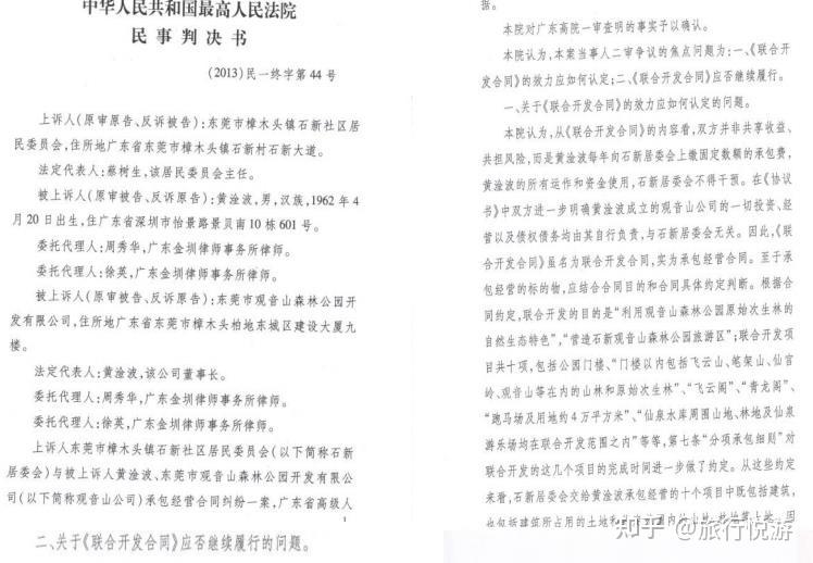 可樟木头镇政府又曾于 2010 年 2 月 1 日根据 2009 年 4 月 8日党政班子联席会议的决定,指示石新居委会(合同主体方)再行通过诉讼方式收回公园范围内所有的土地、建筑物、观光旅游设施及经营权。案件一审广东省高院判决黄淦波与石新居委会所签《联合开发合同》、《协议书》为有效合同应继续履行。原告石新居委会不服判决提起上诉,二审由最高人民法院判决驳回上诉