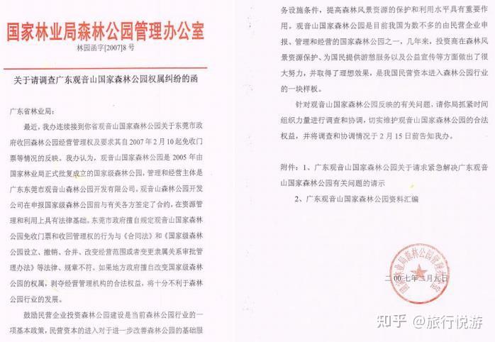 就此问题,2007 年 2 月 9 日,国家林业局森林公园管理办公室及时向广东省林业局下发林园函字[2007]8 号《关于请调查广东观音山国家森林公园权属纠纷的函》,要求广东省林业局抓紧时间组织力量进行调查和协调,切实维护观音山国家森林公园的合法权益并指出:观音山国家森林公园是 2005 年由国家林业局正式批复成立的国家森林公园,管理和经营主体是东莞市观音山森林公园开发有限公司。东莞市政府擅自规定观音山国家森林公园免收门票和收回管理权的行为与《合同法》和《国家级森林公园设立、撤销、合并、改变经营范围或者变更隶属关系审批管理办法》等法律、规章不符。