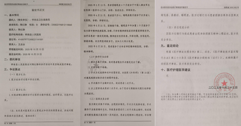 维权路上,法理证据完备,维权之路却寸步难行。据隋红静提供的大量证据,纠纷发生初期,桦南县医院全程矢口否认诊疗过错,拒不承认误诊、误治、术中遗落器械、术后违规转运全部违规事实,百般推诿扯皮、拒不沟通善后、拒绝合理赔付。直至属地桦南县卫生健康局依法介入,委托佳木斯市医学会启动专业医疗事故合规司法鉴定,出具了正式的佳医鉴[2025]002号权威医疗事故鉴定文书。