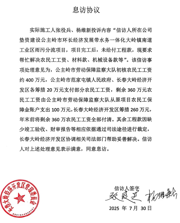 为解决日益激化的矛盾,当地政府再次作出承诺——该雨污分流工程的相关工程款由政府直接承担。随后,当地信访局与实际施工人签订了《息访协议》,明确约定于2025年底前优先解决400万元农民工工资。